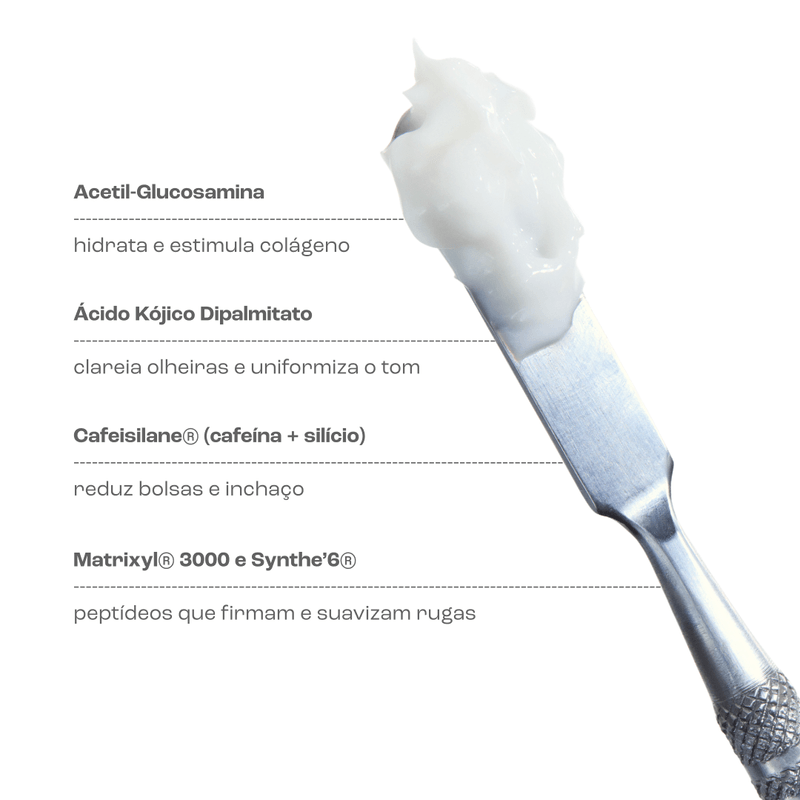 PTBR: Água, Propanodiol, Acetil glucosamina, Hexacaprilato/Hexacaprato de Dipentaeritritil, Glicerol, Coco caprilato/caprato, Neopentanoato de isodecila, Dipalmitato de ácido kójico, Octildodecanol, Extrato de Kappaphycus Alvarezii, Butilenoglicol, Poliacrilato-13, Óleo de Semente de Moringa Oleifera (Moringa), Triglicerídeos de ácido cáprico/caprílico, Fenoxietanol, Octildodecil xilosídeo, Dipolihidroxiestearato de PEG-30, Poliisobuteno, Extrato de Eucheuma Spinosum, Copolímero de Acrilatos de Sódio, Suco da folha de Aloe Barbadensis, Cafeína, Polisorbato 20, Ácido Hialurônico Hidrolisado, Lecitina, Gluconato de sódio, Eilhexilglicerina, Isostearato de sorbitana, Carbômero, Extrato da flor de Crataegus monogyna, Hidroximetoxifenil decanona, Extrato de flor de Jasminum sambac (jasmim), Lactato de Sódio, Alginato de Siloxanetriol, Hidroxipropil Ciclodextrina, Extrato de pseudobulbo de Cyrtopodium Cardiochilum, Ácido Cítrico, Metilparabeno de sódio, Ácido Sórbico, Propilparabeno, Palmitoil Tripeptídeo-38, Palmitoil Tripeptídeo-1, Palmitoil Tetrapeptídeo-7
