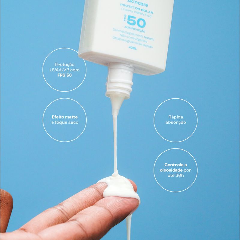 O Watery Fluid FPS 50 da Creamy é um protetor solar ultra fluido, de absorção rápida e acabamento invisível. Ele oferece alta proteção contra os raios solares, ao mesmo tempo em que ajuda a uniformizar a aparência da pele, deixando o tom mais homogêneo e com aspecto saudável.